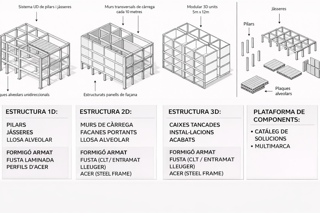 Així mateix, s’incorporen sistemes estructurals prefabricats, façanes industrialitzades i components tridimensionals, amb l’objectiu de millorar la qualitat final de l’edifici i assegurar la seva coherència amb els requisits normatius i energètics actuals.